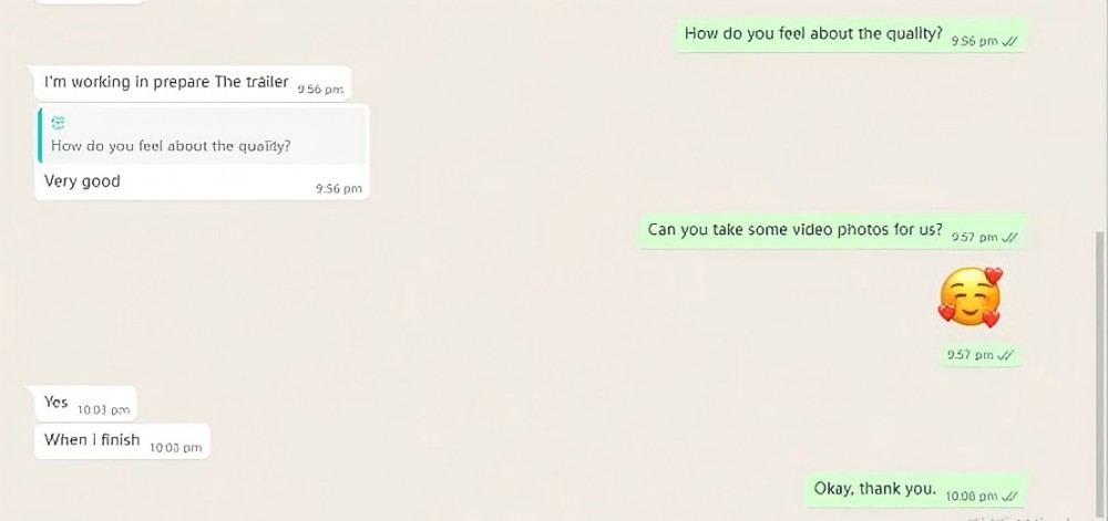 ہمارا عملہ ہر حصے میں تصاویر کھینچے گا: کاٹنے والا بورڈ ، موڑنے ، ویلڈنگ ، پینٹنگ ، جمع کرنے ، پیکنگ ، لوڈنگ ، وغیرہ۔ ہم آپ کو ہر حصے میں تازہ ترین خبریں تفصیلی تصاویر کے ساتھ بھیجیں گے تاکہ آپ اپنے آرڈر کی حیثیت کو بہتر طور پر سمجھ سکیں۔