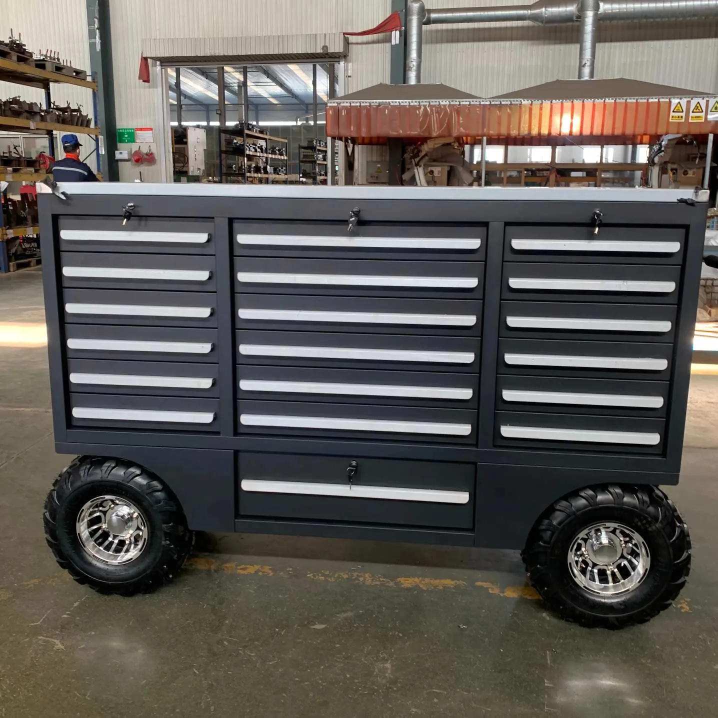 فیکٹری پروڈکشن لائنوں پر ، OEM رولر گیراج ٹول سینے کو چھوٹے پروڈکشن ٹولز اور اسپیئر پارٹس کو ذخیرہ کرنے کے لئے استعمال کیا جاسکتا ہے ، کارکنوں کو پیداواری عمل کے دوران بروقت مطلوبہ اشیاء حاصل کرنے میں مدد فراہم کرتا ہے اور پروڈکشن لائن کے ہموار آپریشن کو یقینی بناتا ہے۔